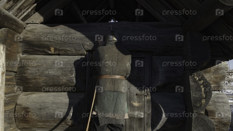 Задний вид древнерусского богатыря в цепной броне и шлеме, идущего к старому деревянному дому.СМИ.Концепция русских легенд и фольклора