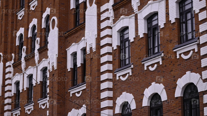 Экстерьер здания из красно-белых кирпичей с темными окнами. Скриншоты. Общественный объект на городской улице
