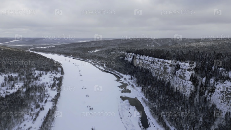 Зимний лесной ландшафт и сосновый лес, растущий на скале над замороженной рекой в снегу