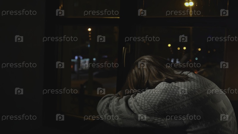 Одинокая молодая женщина смотрит из ночного окна.СМИ. Молодая женщина сидит в окне и печально смотрит на город ночью.Женщина с депрессией сидит одна на окне дома