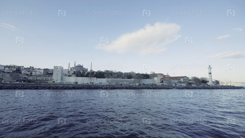 Южный городской пейзаж с берегом, вид с моря. Действие. Красивая голубая морская поверхность и город