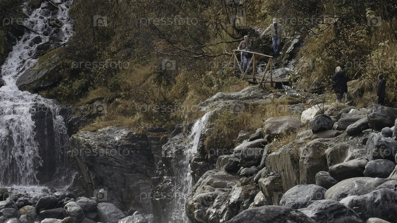 Пешие прогулки по сказочным пейзажам. креативность. осенний лес с переполненными водопадами и деревьями, рядом с которыми ходят люди. высокое качество 4k кадры