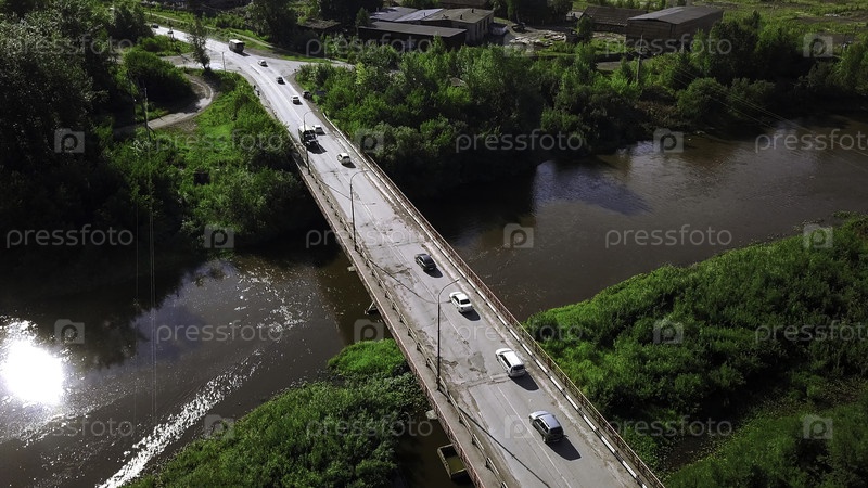Вид с воздуха на реку и мост, где в летний день едут автомобили. Клип. Летняя деревня вокруг зеленой растительности