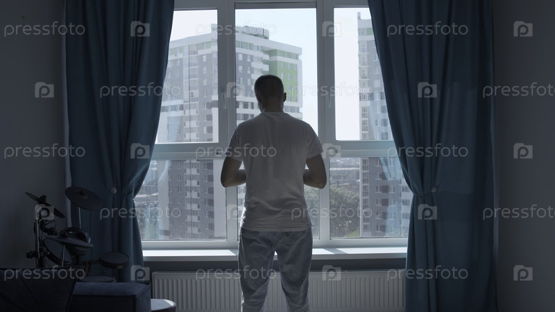 Сзади виден задумчивый мужчина, стоящий дома у окна и смотрящий на город.СМИ.Мужчина в домашней одежде проводит время в отражении в своей спальне