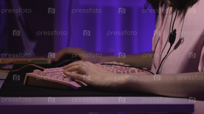 Близкий план молодой женщины, играющей в компьютерные игры. Скриншоты. Игрок играет на компьютере, нажимая клавиатуру и мышь. Девушка играет в компьютерные игры с помощью клавиатуры