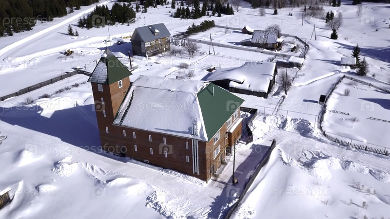 Вид с воздуха на деревню зимой, детали сельской местности. Клип. коттедж из красного кирпича и небольшие дома, снежный грунт