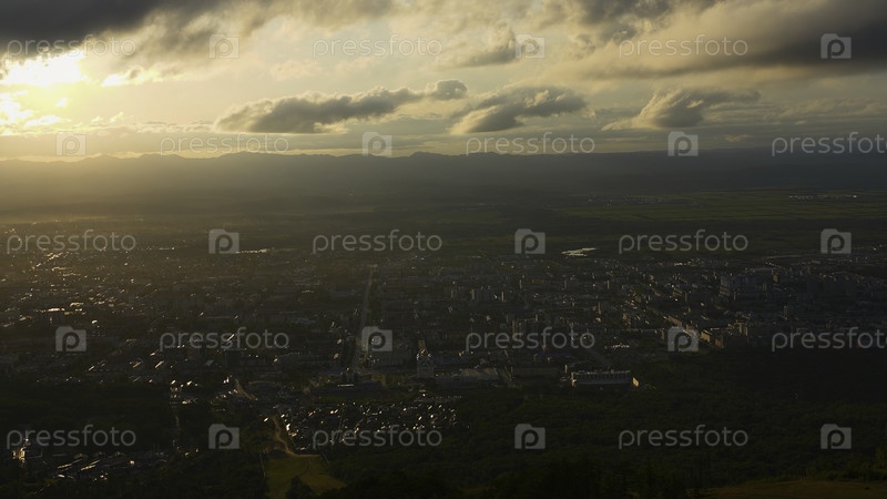 Вид сверху города в зеленой долине со солнцем на горизонте. Клип. Красивый пейзаж солнечной зеленой долины с городом в летний день. Яркое солнце светит вниз по долине с городом