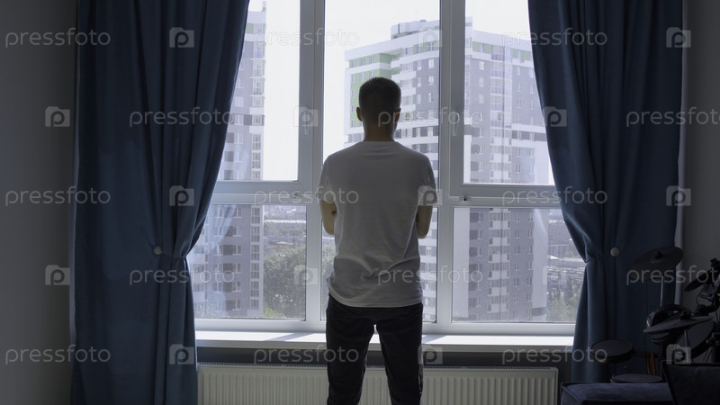 Молодой уверенный в себе мужчина, смотрящий через окно дома со скрученными руками СМИ Задний вид молодой модели
