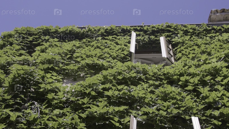 Зеленые деревья, на которые падает солнечный свет. Действие. Красивый пейзаж с кустарниками и домами и видимы лучи яркого солнца