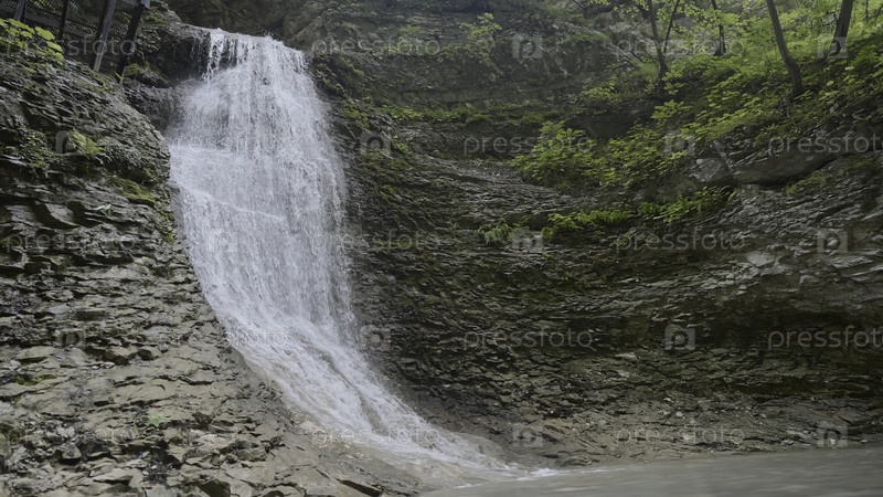 Красивый водопад, ручей из скалы. Действие. Живописный водопад со скалой в лесу. Прекрасный водопад с потоком воды в летнем лесу