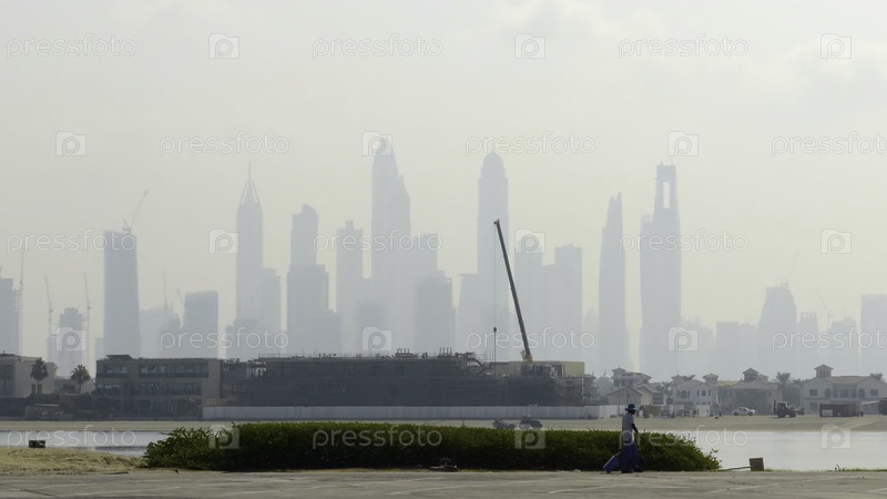 Вид с набережной на небоскребы города в тумане. Действие. Высокие здания в утренней дымке