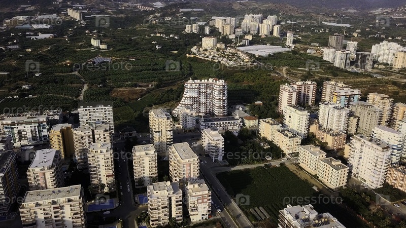 Аэрофотосъемка города с большим количеством женщин.Клип.Летний зеленый город в утреннем тумане