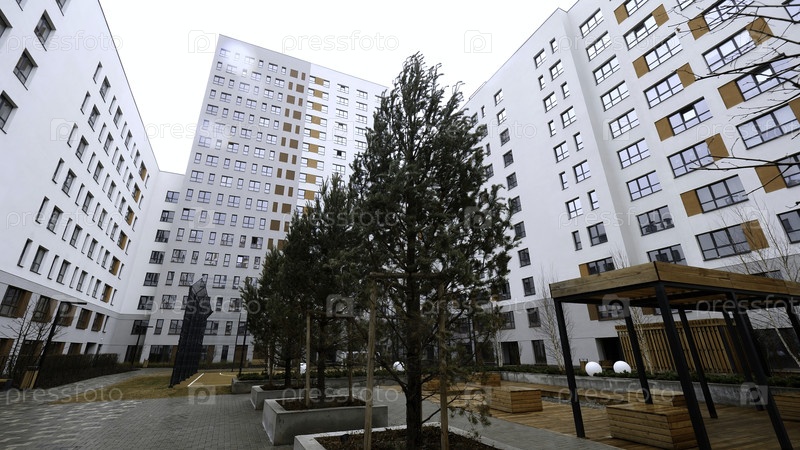 Закрытый двор с высокими домами. Фрагменты акций. Большие многоэтажные дома вокруг закрытых дворов с игровыми площадками. Высококачественное видео 4k