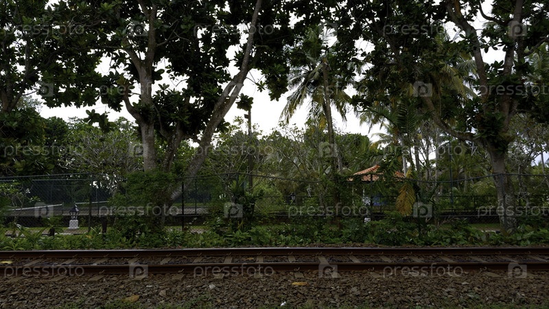 Железнодорожные пути в лесу, боковой вид. Действие. Ландшафт деревни и железная дорога