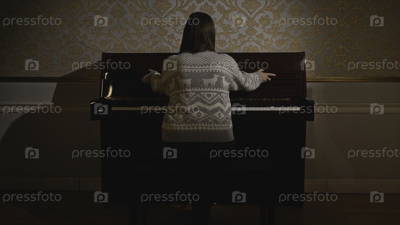 Женщина начинает играть на фортепиано.СМИ.Задний вид молодой женщины, играющей на фортепиано.Женщина в старом свитере играет на старом пианино