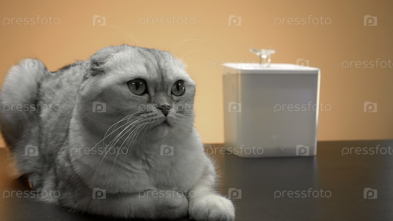Отдыхающий белый питомец. Действие. Милая маленькая белая кошка лежит рядом с небольшим фонтаном для питья