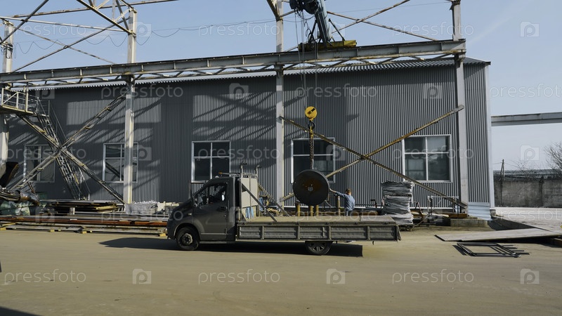Рабочий-техник, использующий подъемный кран для поднятия металлических деталей на фабрике мастерской