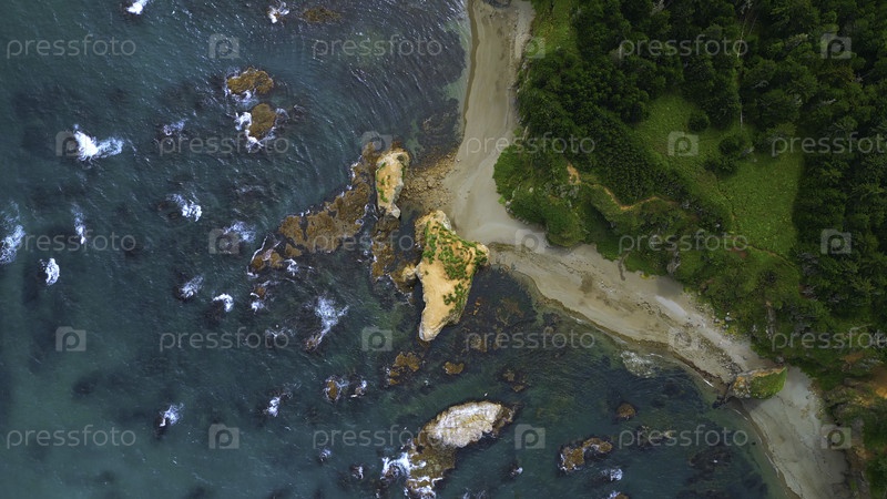 Вид сверху берега с скалами в воде и лесу. Клип. Удивительная природа побережья с красивыми скалами и чистой водой. Дикое побережье со скалами в бирюзовой воде и зеленый лес в солнечный день