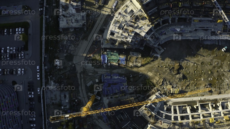 Вид сверху на строительство стадиона. Скриншоты. Строительная площадка с кранами и машинами в центре города. Строительство спортивной арены в городе в солнечный летний день