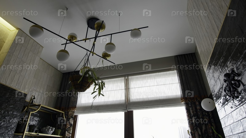 Низкий угол обзора стильной современной люстры с висящим растением. креативность. детали небольшой комнаты с контрастными темными и бежевыми стенами
