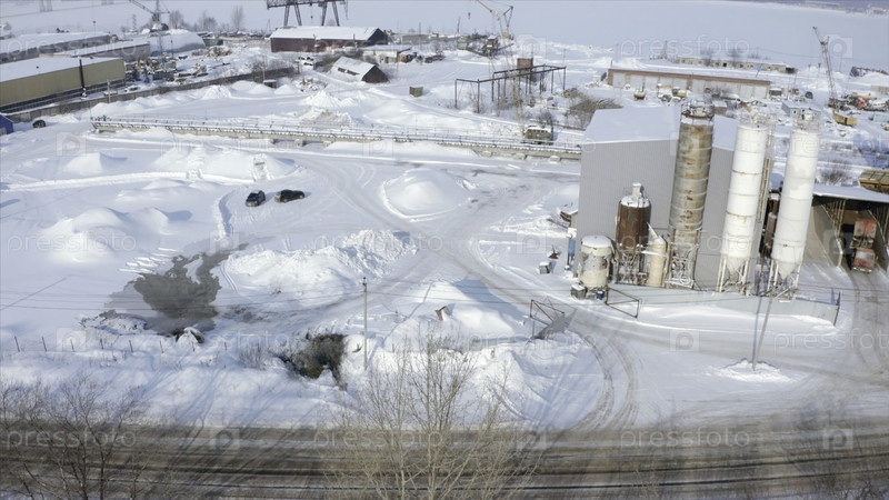 Вид сверху небольшой фабрики у реки зимой. Клип. Малый промышленный завод в солнечный зимний день. Промышленная зона на окраине зимой