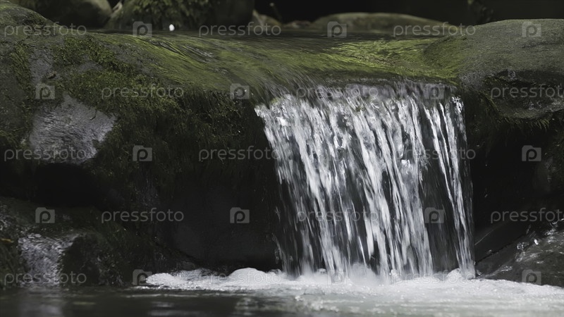 Ближайший снимок небольшого водопада в лесной каменной реке.Креативно.Прекрасный поток маленького каскада лесной реки.Прекрасный каскад в каменном русле реки
