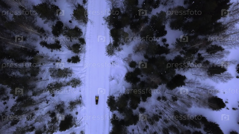 Зимняя дорога между деревьями, снятая из беспилотника. клип. зимние пейзажи с движущимся человеком на мотоцикле в темном лесу
