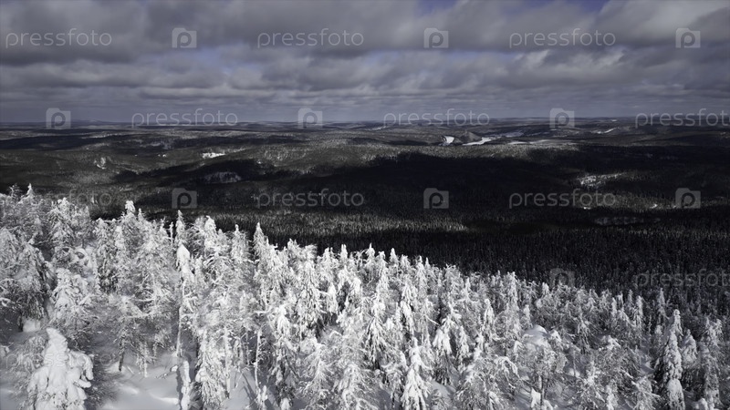 Зимняя сцена на горнолыжном курорте в природном парке. Клип. Вид с воздуха лесистой долины и холодного зимнего грунта