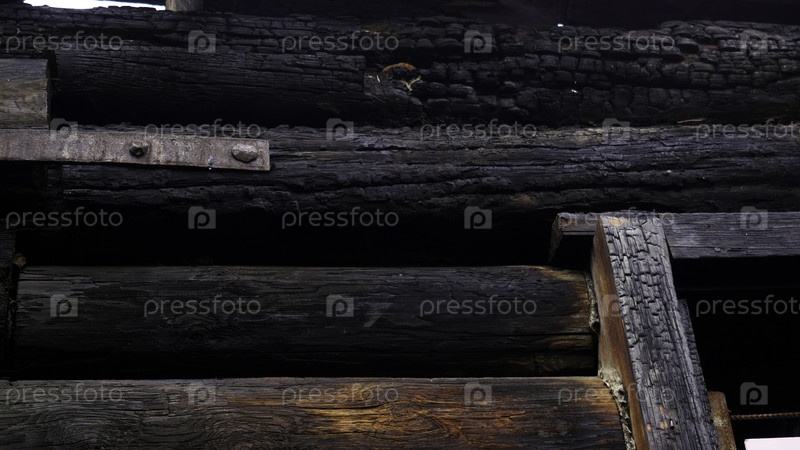 Сожженный дом.Стоп кадров.Сожженные деревянные бревна черного цвета.Высококачественная запись 4k