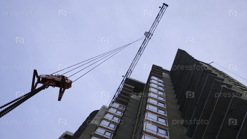 Высокий кран работает на стройплощадке. Клип. Строительство жилых зданий, многоэтажный жилой комплекс в стадии строительства