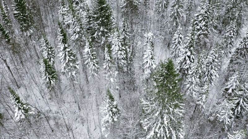 Вид с воздуха зимнего соснового леса. Клип. Летающий над снежными вершинами деревьев