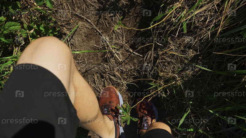 Ближайший снимок мужчины, идущего по тропинке с зеленой травой. Клип. Человек в спортивных кроссовках ходит по горной дорожке в солнечный летний день