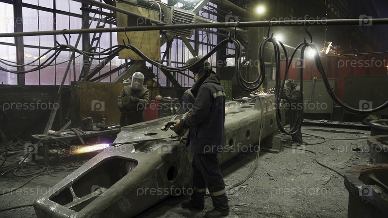Промышленная мастерская, где рабочие изготавливают различные металлические компоненты для производства