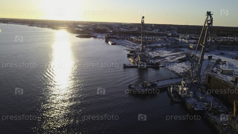 Вид сверху грузового порта с кораблями на реке. Клип. Красивый пейзаж с морскими грузовыми портами зимой. Грузовой порт на берегу реки в солнечный зимний день