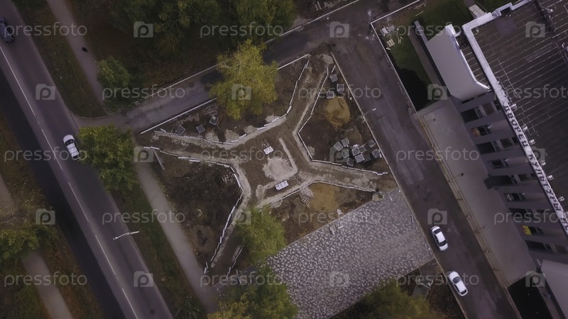Образец парковых дорожек возле здания. Клип. Вид сверху дворового ландшафта с парком рядом со зданиями. Линии пешеходных троп в ландшафте двора с парком