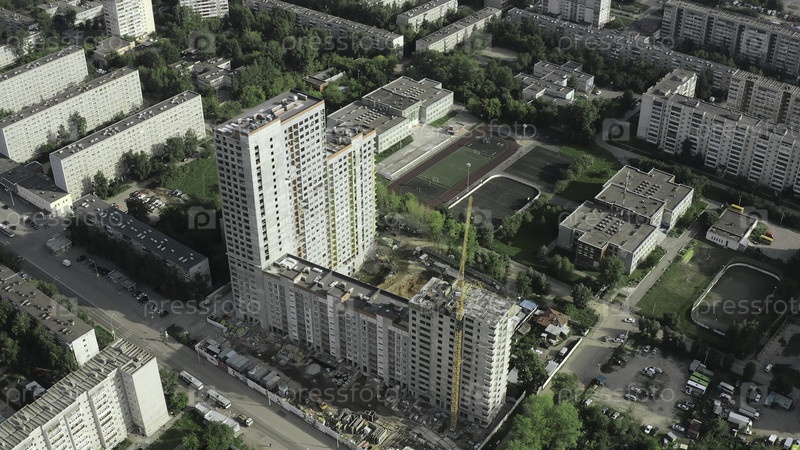Жилой комплекс, находящийся в стадии строительства в городе летом. Сценарий. Районы города с зелеными дворами и жилыми домами. Строительство жилого комплекса в городе со зелеными растениями летом