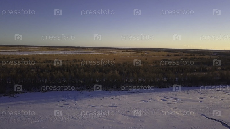 Сухая коричневая трава на зимнем лугу. Клип. Вид с воздуха голубого чистого неба и золотистого поля