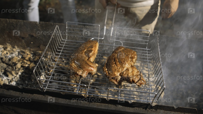 Близкий план мужчин, жарящих курицу на гриле в лесу. Скриншоты. Вкусная цыпленочка-гриль с барбекю в солнечный летний день. Мужчины готовят курицу на гриле и отдыхают в лесу