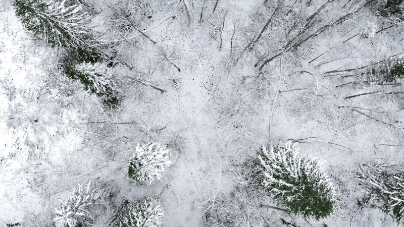 Зимний воздушный пейзаж со смешанным лесом и белоснежной землей. Клип. Замерзшая холодная природа, вид сверху