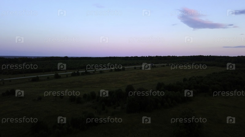 Прекрасные зеленые поля и теплый закат солнца