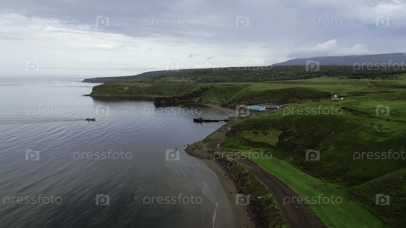 Вид с воздуха на небольшой речной порт.Клип.Прекрасная долина и большая река