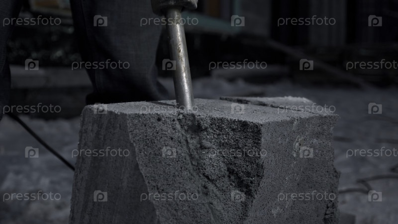 Ближайшее изображение бурения цементного блока.Клип.Промышленные работы на строительной площадке
