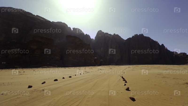 Почувствуйте потрясающий пустынный пейзаж с солнечными горами и извилистыми тропами через песчаную местность