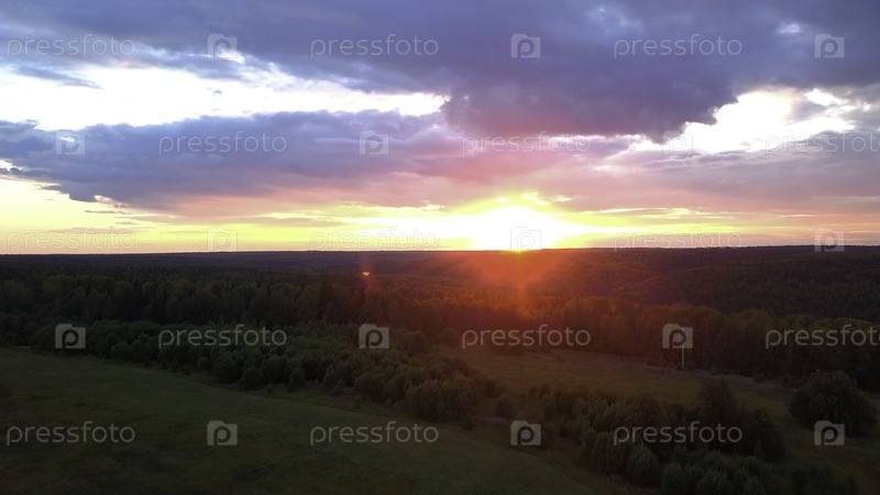 Киносъемка из воздуха бесконечного холмов и лесного пейзажа в южной Словении. Клип. Летний полет над густым лесом на фоне заката облачного неба