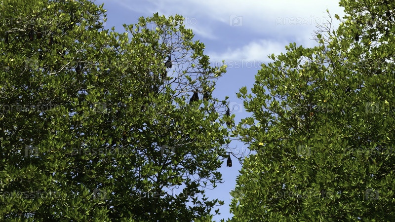 Красивые зеленые деревья с летучими мышами. Действие. Черные лягушки спят на деревьях в солнечный летний день. Тропические летучие мыши на зеленых деревьях в солнечный день