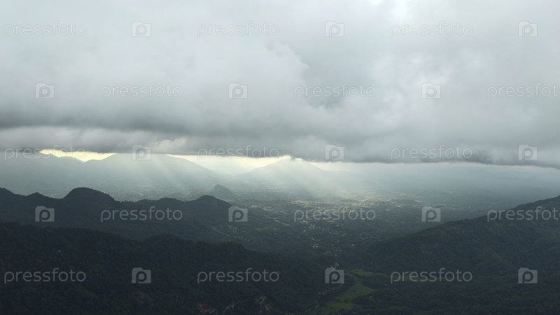 Красивый вид на горно-зеленую долину с облаками и солнечным светом. Действие. Живописный пейзаж зеленых гор и низких облаков, через которые проникает солнце. Солнечные лучи на горизонте в зеленой горной долине