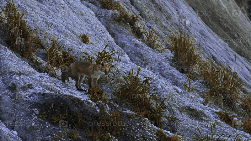 Красивая красная лиса с добычей в осенней траве. Клип. Лиса взяла пищу во рту и забрала ее. Дикая лиса охотится в среде с осенней травой на скалистом склоне