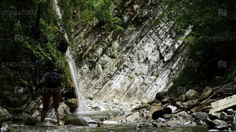 Красивый водопад в зеленом лесу.Креативная женщина пересекает тропическую реку в горном джунглях