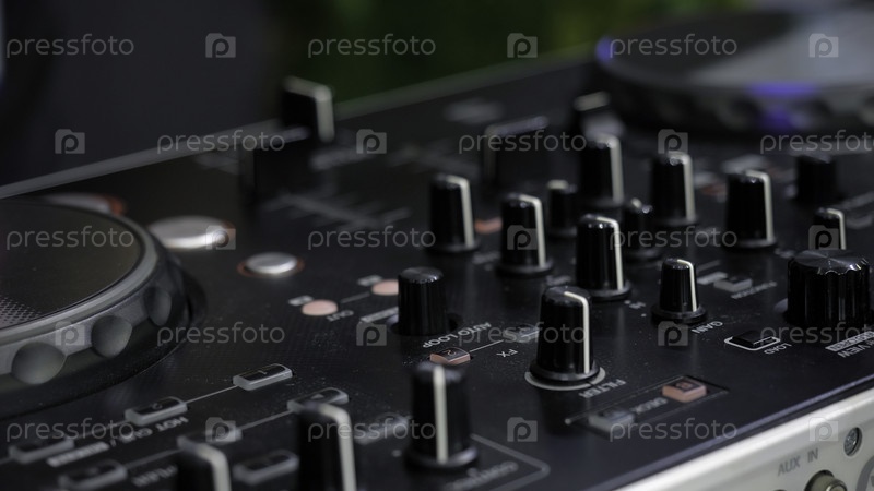 Мужчина в звуковой студии, работающий с консолью звукового миксера.Медиа.Руки DJ и звуковая машина, музыкальное производство