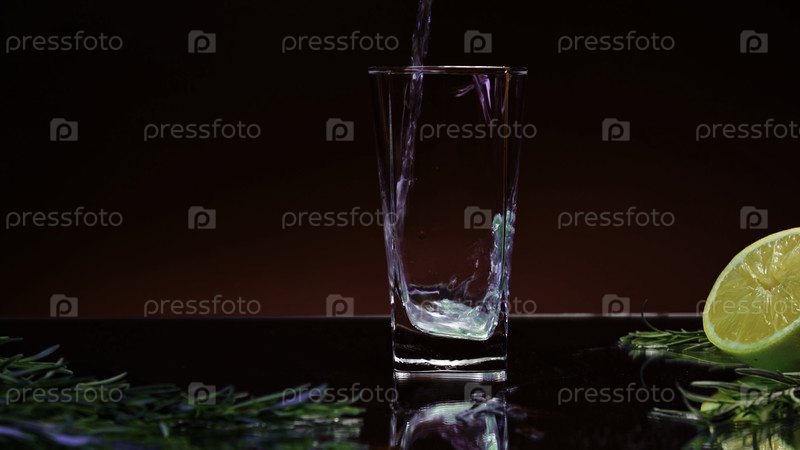 Близость к заполнению пустого бокала свежим зеленым напитком. Запасный зажигалка. Детали бара с половиной апельсина и розмарином